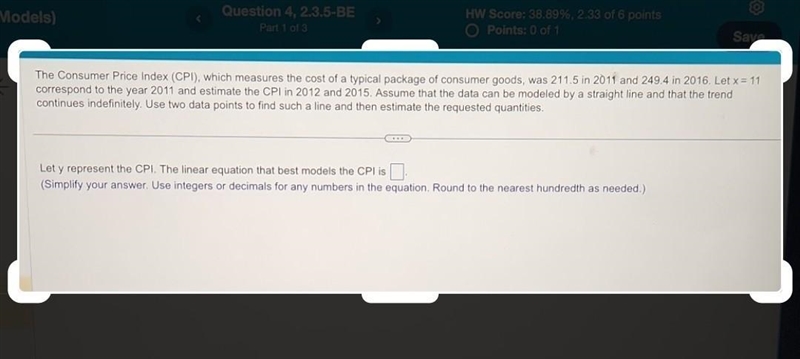 The Consumer Price Index (CPI), which measures the cost of a typical package of consumer goods, was 211.5 in 2011 and 249.4 in 2016. Let x = 11 correspond to the year 2011 and estimate the CPI in 2012 and 2015. Assume that the data can be modeled by a straight line and that the trend continues indefinitely. Use two data points to find such a line and then estimate the requested quantities. Let y represent the CPI. The linear equation that best models the CPI is. (Simplify your answer. Use integers or decimals for any numbers in the equation. Round to the nearest hundredth as needed.)