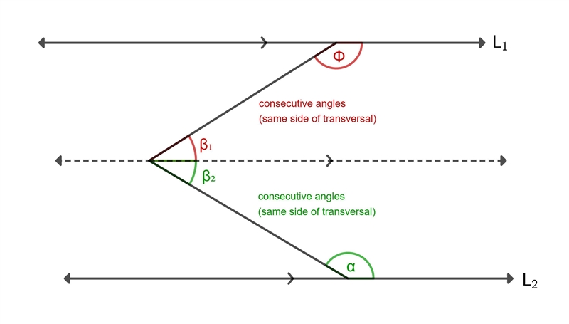 If we draw a horizontal line that is parallel to L₁ and L₂ and that passes through the vertex of angle β, we create two sets of consecutive interior angles (see attachment).
