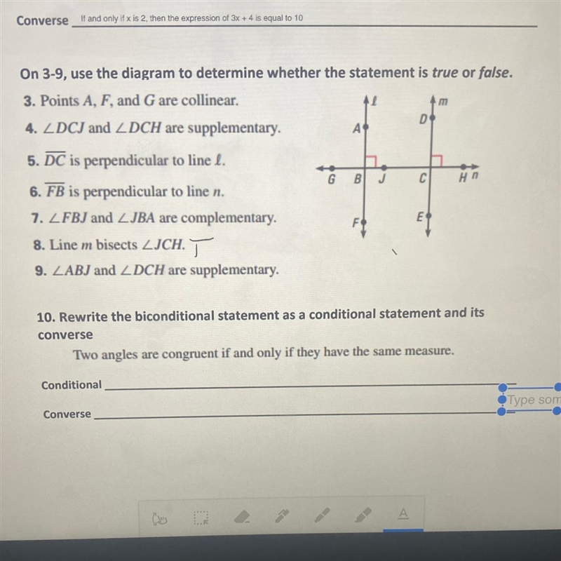 9. True, angle ABJ and angle DCH are supplementary because they have right angle markings on them indicating that each of them measures 90 degrees. In order for there to be supplementary angles, their angle measures have to sum up to 180 degrees, so when you add these two angle measures together (90 + 90) they equal 180 degrees which defines supplementary.