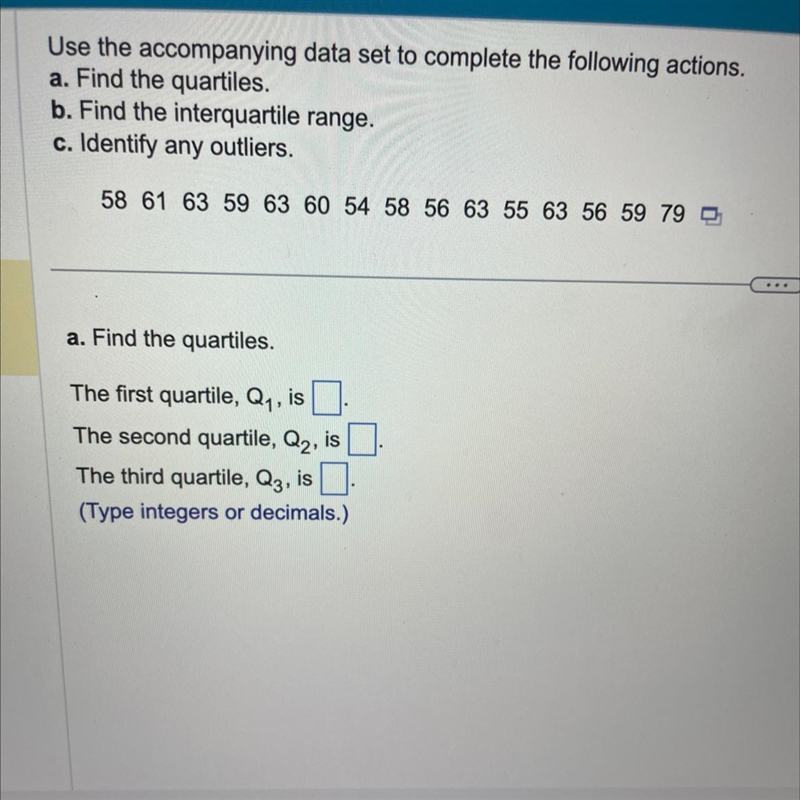 - Q2 is the median of the entire data set. With 19 values, the median is the 10th value when sorted, which is 59.
