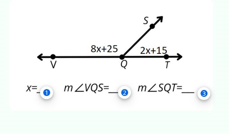 We know the sum of the two angles VQS and SQT is equal to 180 degrees since it is a straight line. We can therefore write: