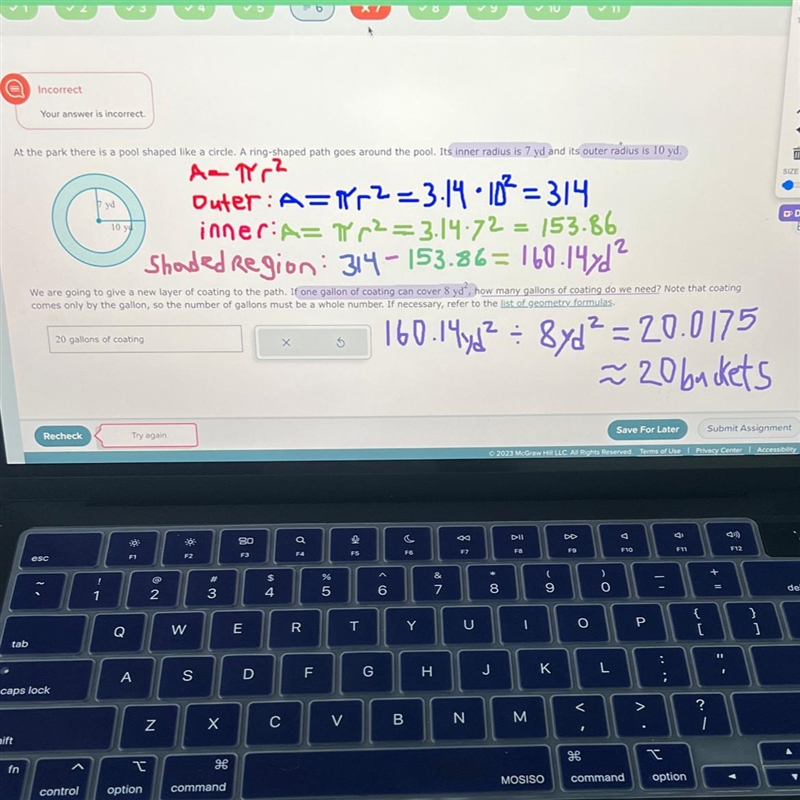 And finally calculate how many gallons of coating are needed to cover the ring-shaped path: