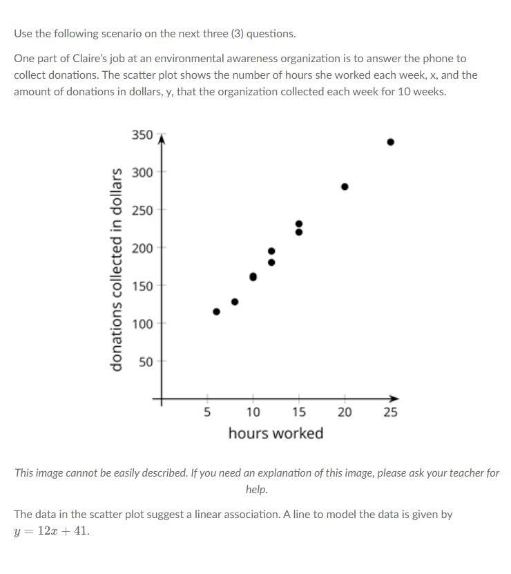 Based on the information provided, the question is asking for the amount of additional money the organization brings in for each extra hour that Claire works. To answer this question, we need the missing information, which is the amount. Once we have that information, we can calculate the increase in donations by multiplying the amount by the number of extra hours. For example, if we assume that for each extra hour Claire works, the organization brings in an additional $10, and she works 5 extra hours, then the increase in donations would be $10 × 5 = $50.