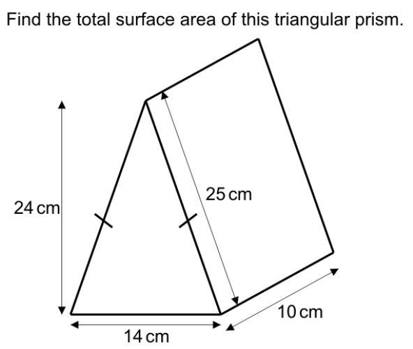 meaning you can calculate the area of two of the triangles that make up the triangular prism using 2((1/2)(14)(24)). The formula to calculate any regular quadrilateral is bh, meaning you can then calculate the two square sides of the same size using 2(10 * 25). Finally, use the formula bh to calculate the area of the base which is (14 * 10). Add up all the numbers to then get the final answer, 2((1/2)(14)(24)) + 2(10 * 25) + (14 * 10) = 976 cm^2.