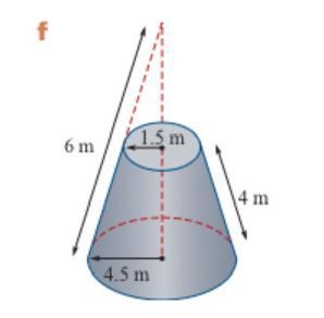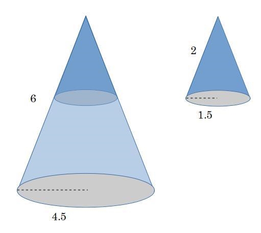 ![\textit{Surface area of the \underline{larger} Cone}\\\\ SA=\pi rs + \pi r^2~~ \begin{cases} r=radius\\ s=\textit{slant height}\\[-0.5em] \hrulefill\\ r=4.5\\ s=6 \end{cases} \implies SA=\pi (4.5)(6)+\pi (4.5)^2 \\\\\\ SA=27\pi +20.25\pi \implies SA=47.25\pi ~m^2 \\\\[-0.35em] ~\dotfill](https://img.qammunity.org/2024/formulas/mathematics/college/pu4utr9tbdwplma7fucl8a97k4akw97eo7.png)