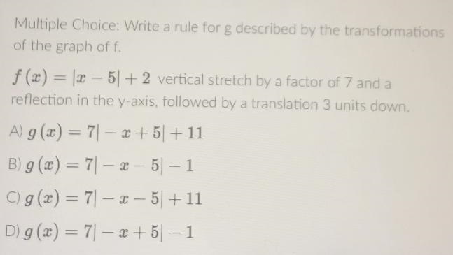 You want to transform f(x) = |x -5| +2 with a vertical stretch by a factor of 7, reflection over the y-axis, and translation 3 units down.
