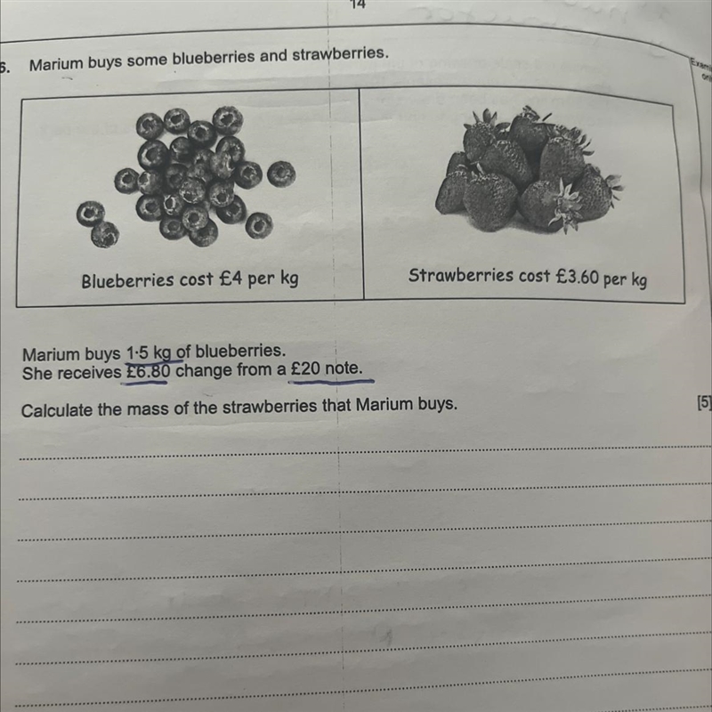 Marium buys some blueberries and strawberries. Blueberries cost £4 per kg Strawberries cost £3.60 per kg Marium buys 1-5 kg of blueberries. She receives £6.80 change from a £20 …