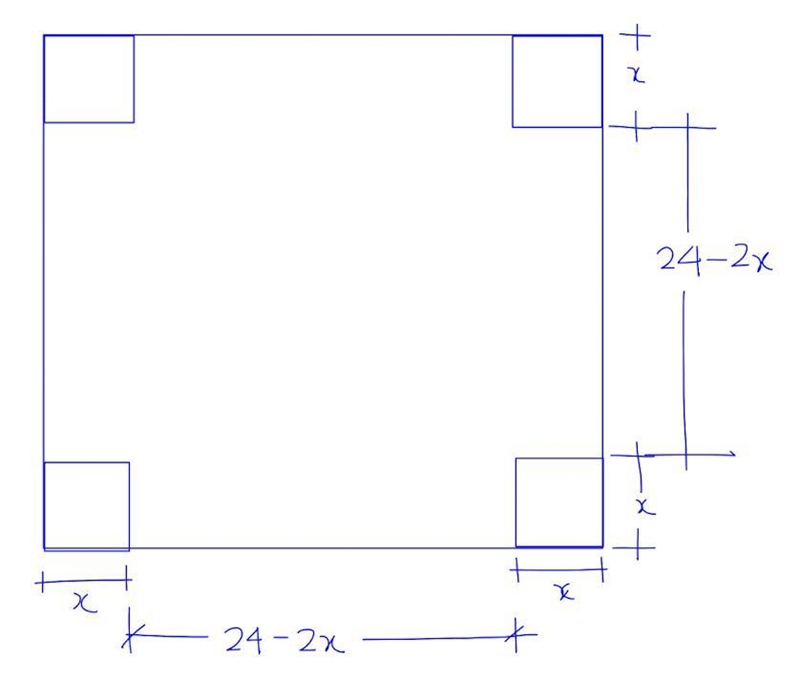 (which is not available, because the length/width of the box = (24 - 2x)" → if x = 12" meaning length/width = 0)