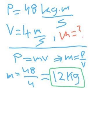 21. A ball is moving at 4 m/ s and has a momentum of 48 kg.m/ s. What is the ball's mass? a. 4 kg b. 12 kg c. 48 kg d. 192 kg e. none of these