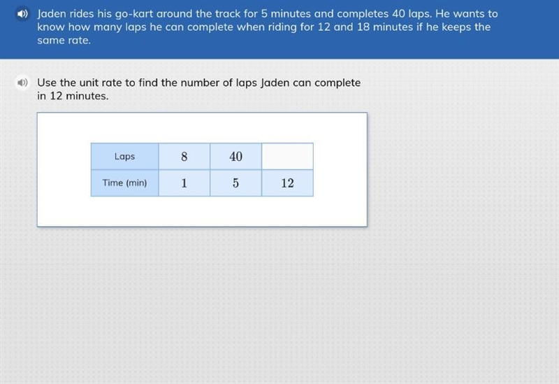 8 laps/ 1 minute * 12 minutes = 96 laps