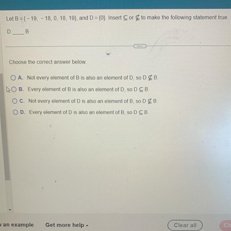 Let B=(-19, 18, 0, 18, 19), and D= {0}. Insert C or C to make the following statement true.