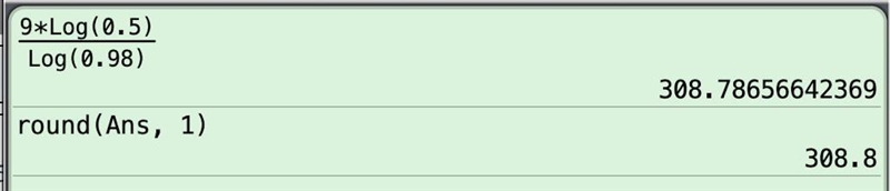 h = 9·log(0.5)/log(0.98) ≈ 308.8 . . . . . hours