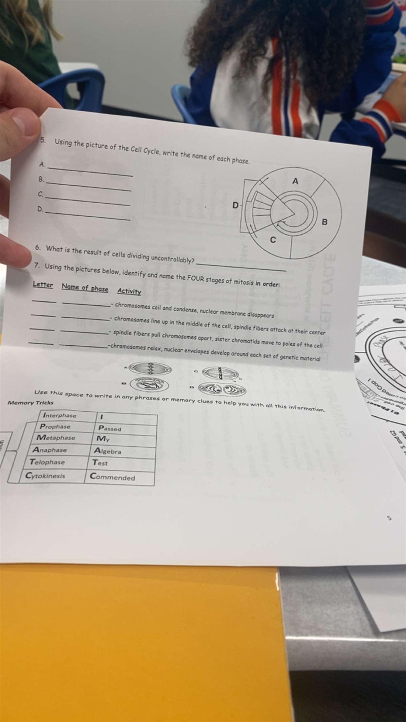 - Passed My Algebra Test: Prophase, Metaphase, Anaphase, Telophase (order of mitosis phases)