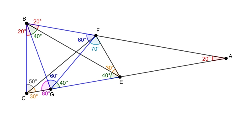 Draw a line segment BG at 20° to BC intersecting AC at point G between points C and E.