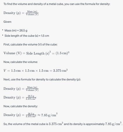 Find the volume and density of a metal cube 1.5 cm on a side. It has a mass of 26.5 g