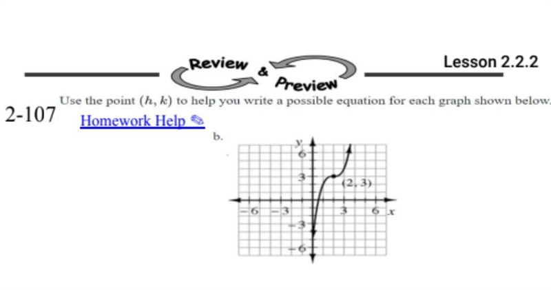 The inflection point of the parent function is located at the origin (0, 0). Therefore, the graphed function can be obtained by translating the parent function 2 units to the right and 3 units up. When we translate a function "n" units to the right, we subtract "n" from the x-variable. When we translate a function "n" units up, we add "n" to the function. Therefore, the equation for the translated function is: