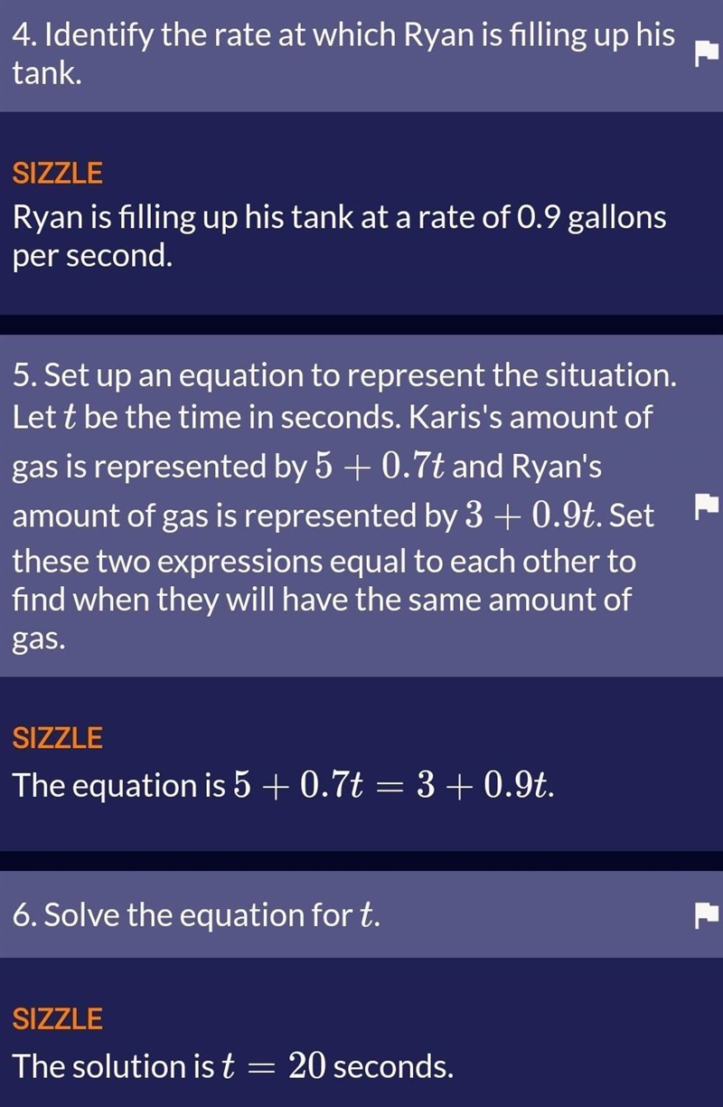 Let's first determine how many gallons Karis has after t seconds. We know that she already had 5 gallons, and she is filling up her tank at a rate of 0.7 gallons per second. So, the number of gallons Karis has after t seconds can be represented by the equation: