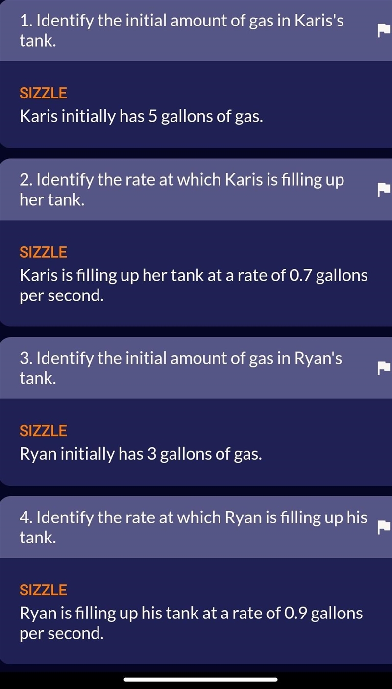 Now, to find the time it takes for both Karis and Ryan to have the same amount of gas in their tanks, we need to set the two equations equal to each other: