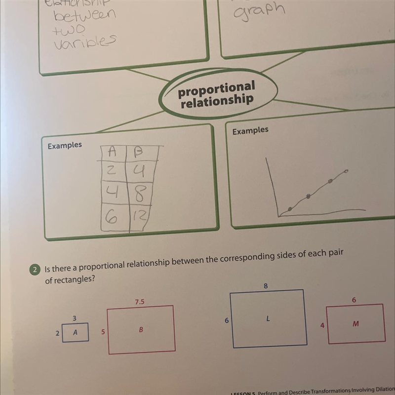 To determine if there is a proportional relationship between the corresponding sides of the two rectangles, we compare the ratios of their lengths and widths.