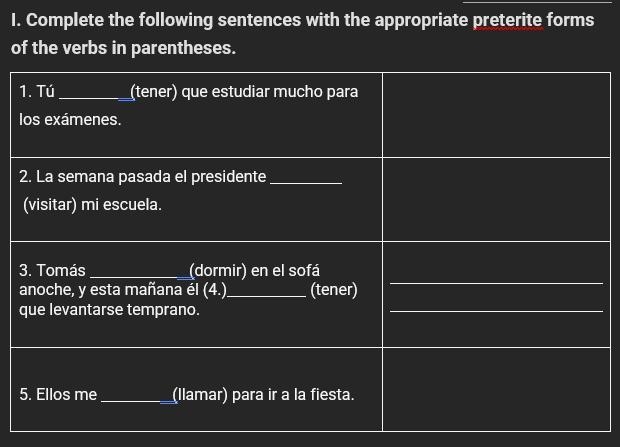 Answer: 1. tienes 2. visito 3. dormio 4. tiene 5. llaman