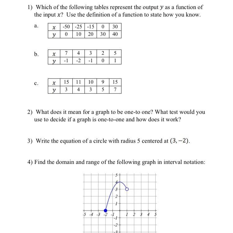 To determine which table represents the output y as a function of the input x, we need to check if each input value x corresponds to a unique output value y. In a function, each input can only have one output. Looking at table a, we see that the input values -50, -25, -15, and 0 have different output values. However, the input value 10 corresponds to two different output values (20 and 30). Therefore, table a does not represent a function. Table b also does not represent a function because the input value 0 corresponds to two different output values (7 and 4). Table c, on the other hand, does represent a function. Each input value has a unique output value, and there are no repeating input-output pairs. So, table c represents the output y as a function of the input x because it satisfies the definition of a function: each input has a unique output. 2) A graph is said to be one-to-one if each input value corresponds to a unique output value, and no two input values correspond to the same output value. In other words, a one-to-one graph does not have any repeating points. To determine if a graph is one-to-one, we can use the horizontal line test. The horizontal line test involves drawing horizontal lines across the graph and checking if each horizontal line intersects the graph at most once. If every horizontal line intersects the graph at most once, then the graph is one-to-one. However, if any horizontal line intersects the graph more than once, then the graph is not one-to-one. 3) The equation of a circle with radius 5 and center (h, k) is given by the formula: (x - h)^2 + (y - k)^2 = r^2 where (x, y) represents any point on the circle. In this case, the center of the circle is (3, -2) and the radius is 5. Plugging these values into the equation, we have: (x - 3)^2 + (y - (-2))^2 = 5^2 Simplifying the equation, we get: (x - 3)^2 + (y + 2)^2 = 25 So, the equation of the circle with radius 5 and center (3, -2) is (x - 3)^2 + (y + 2)^2 = 25. 4) To find the domain and range of a graph, we need to determine the set of all possible input values (domain) and the set of all possible output values (range). Looking at the graph provided, we see that the input values extend from -5 to 3, including both endpoints. So, the domain of the graph is the interval [-5, 3]. For the range, we observe that the output values extend from -2 to 2, including both endpoints. Therefore, the range of the graph is the interval [-2, 2]. In interval notation, the domain is [-5, 3] and the range is [-2, 2]
