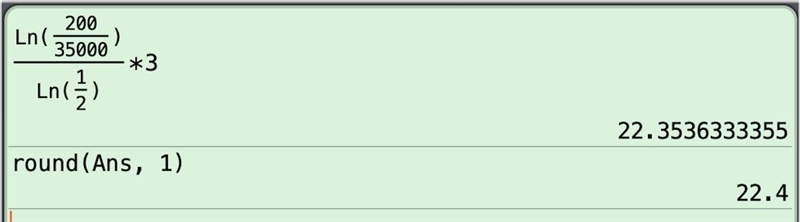 t = 3(ln(200/35000)/ln(1/2)) ≈ 22.4 . . . . years