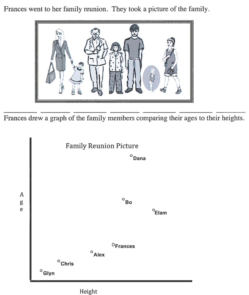 Now we look in the graph. The heights are plotted along the horizontal axis, so the more to the right a name is, the taller a person is. Start from the right of the graph and read the names moving left. Ignore the position along the vertical axis of where the name is. In other words, ignore how high or low on the graph a name is. Just take into account how far right or left the name is.