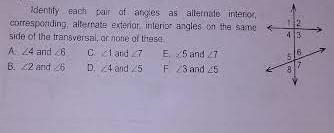 In helping you identify angles in parallel line configurations with a transversal, the terms alternate interior angles, corresponding angles, alternate exterior angles, and 'none of these' are used to describe the relative positions of angles. Here's how each of these is defined: