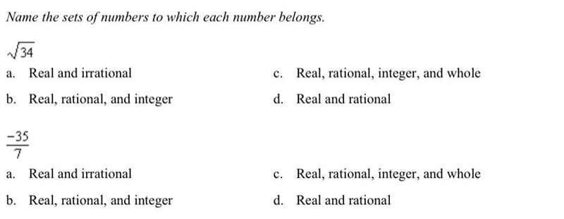 c. Real, rational, integer, and whole