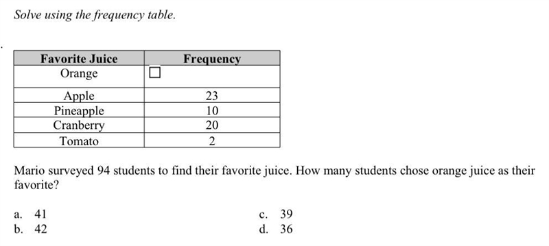 Mario surveyed 94 students to find their favorite juice. How many students chose orange-example-1