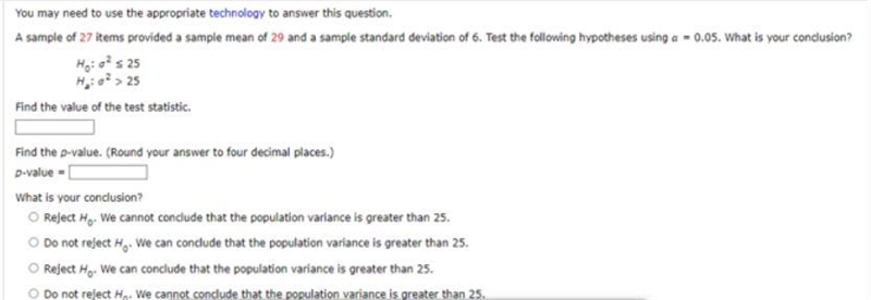 The test statistic for the sample variance is 37.44. With a p-value of 0.0682, which is greater than the significance level of 0.05, we do not reject the null hypothesis. Therefore, we cannot conclude that the population variance is greater than 25.