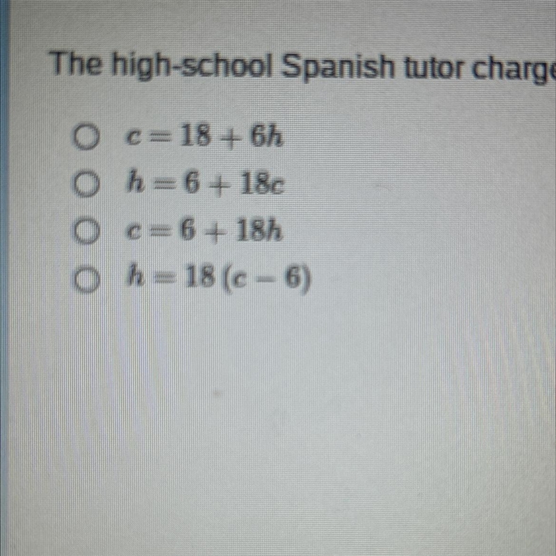 The high-school spanish tutor charges $18 per hour. they charge an initial travel fee of $6. which rule is correct for the total cost, c, of hiring the tutor for tutoring hours?…