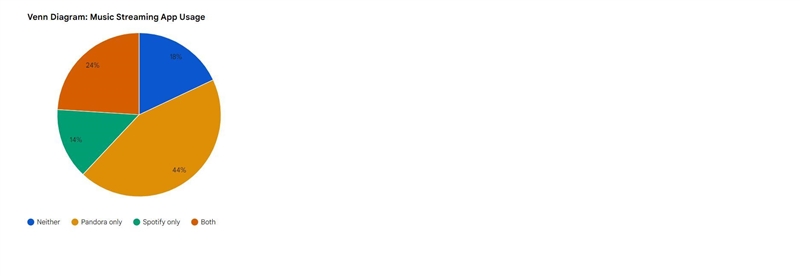 a) The Venn diagram for this scenario can be drawn with two circles, one for Pandora (P) and one for Spotify (S), and their intersection indicating those who use both.