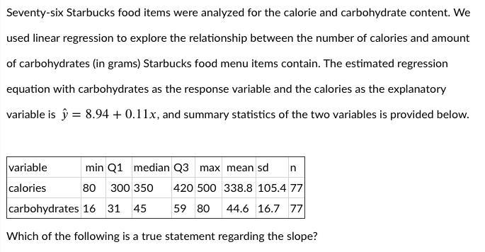 The correct statement regarding the slope is that there is a positive association between calorie and carbohydrate content in Starbucks food items, as indicated by the positive slope of 0.11. However, the magnitude of the slope does not directly measure the strength of this association.