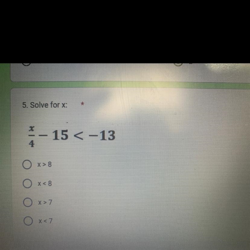 X/4 -15 < -13 x>7 x<7 X>8 x < 8