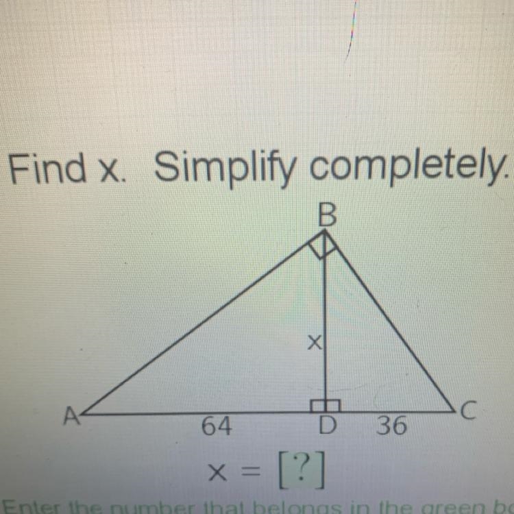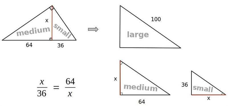 You want to know the altitude of a right triangle when that segment divides the hypotenuse into parts that are 64 and 36 units.
