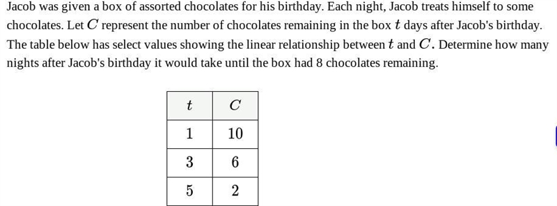 Given that there is a linear relationship between chocolates remaining (C) and nights after Jacob's birthday (t), you want to know the value of t when C=8.