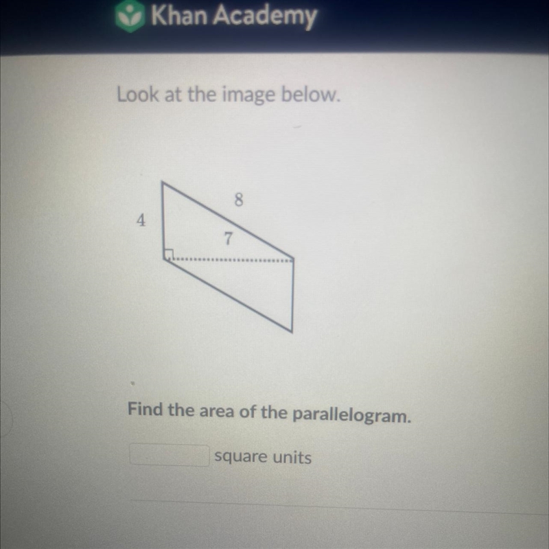 Look at the image below. 4 8 7 Find the area of the parallelogram. square units-example-1