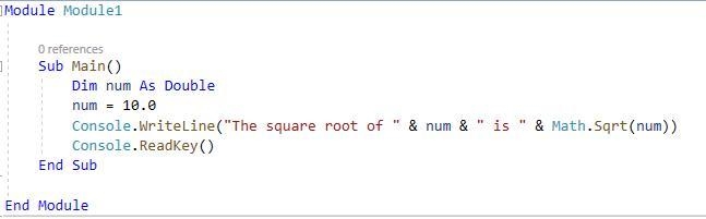 program 3.Study the code carefully and write out the line where there is error, debug it and write out the correct code 1. ModuleModule1 2. Sub Main() 3. Dim num AsDouble 4. Num=10.0 5. Console.writeLine('The square root of '# & "is"$Math.sqrt(num)) 6. Console.ReadKey() 7. EndSub 8. EndModule