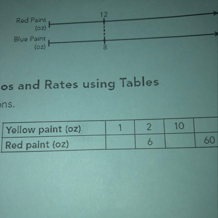 Start by determining the ratio of yellow to red paint. Use the column where both amounts are given:
