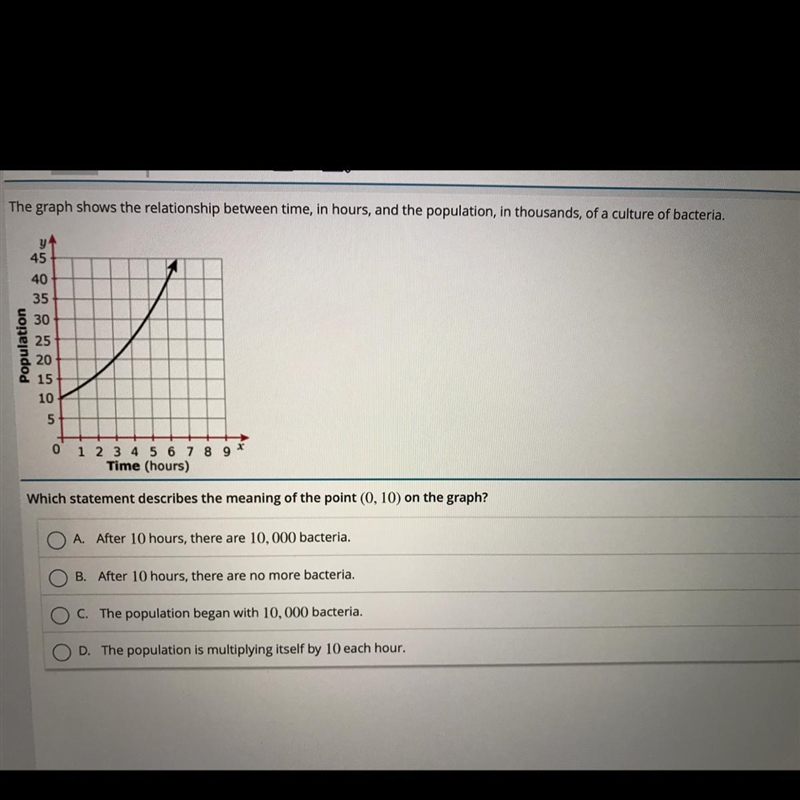 Therefore, the point (0,10) represents the time x = 0 hours and the population y = 10,000.