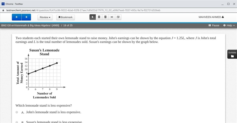 Two students each started their own lemonade stand to raise money. John's earnings can be shown by the equation J = 1.25L, where J is John's total earnings and L is the total number of lemonades sold. Susan's earnings can be shown by the graph below.