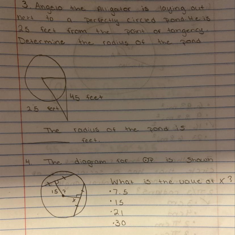 3. Using r for the radius of the pond, we have a right triangle with sides r and 45 ft, and hypotenuse (25+r) feet. The Pythagorean theorem tells us ...