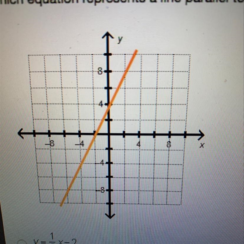 Which equation represents a line parallel to the line shown on the graph? • y=1/2x-2 • y=-1/2x+3 • y=2x+1 • y=-2x+4