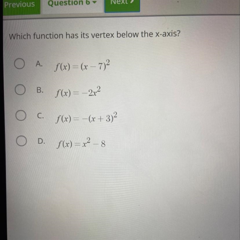 I need helpp. Which function has its vertex below the x-axis-example-1