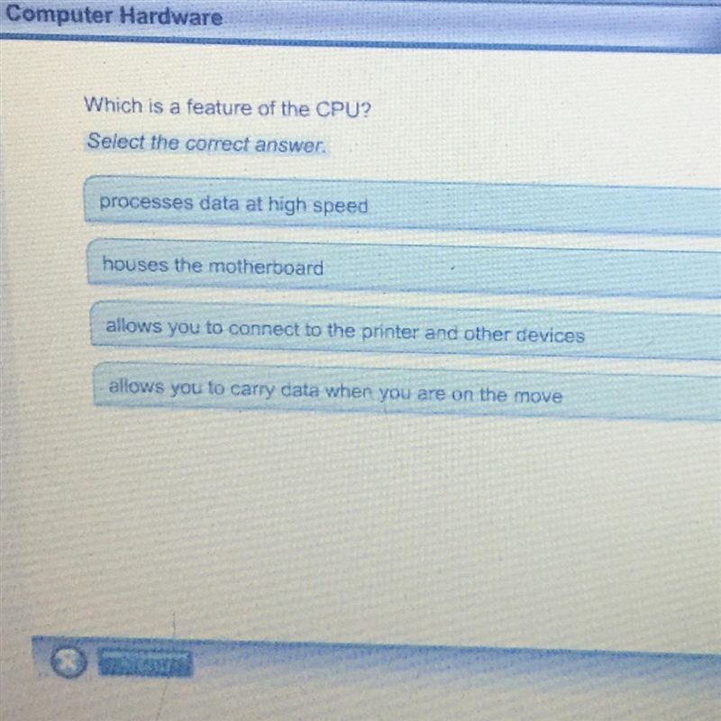 Which is a feature of the CPU? A. Processes data at high speed B. Houses the motherboard C. Allows you to connect to the printer and other devices D. Allows you to carry data wh…