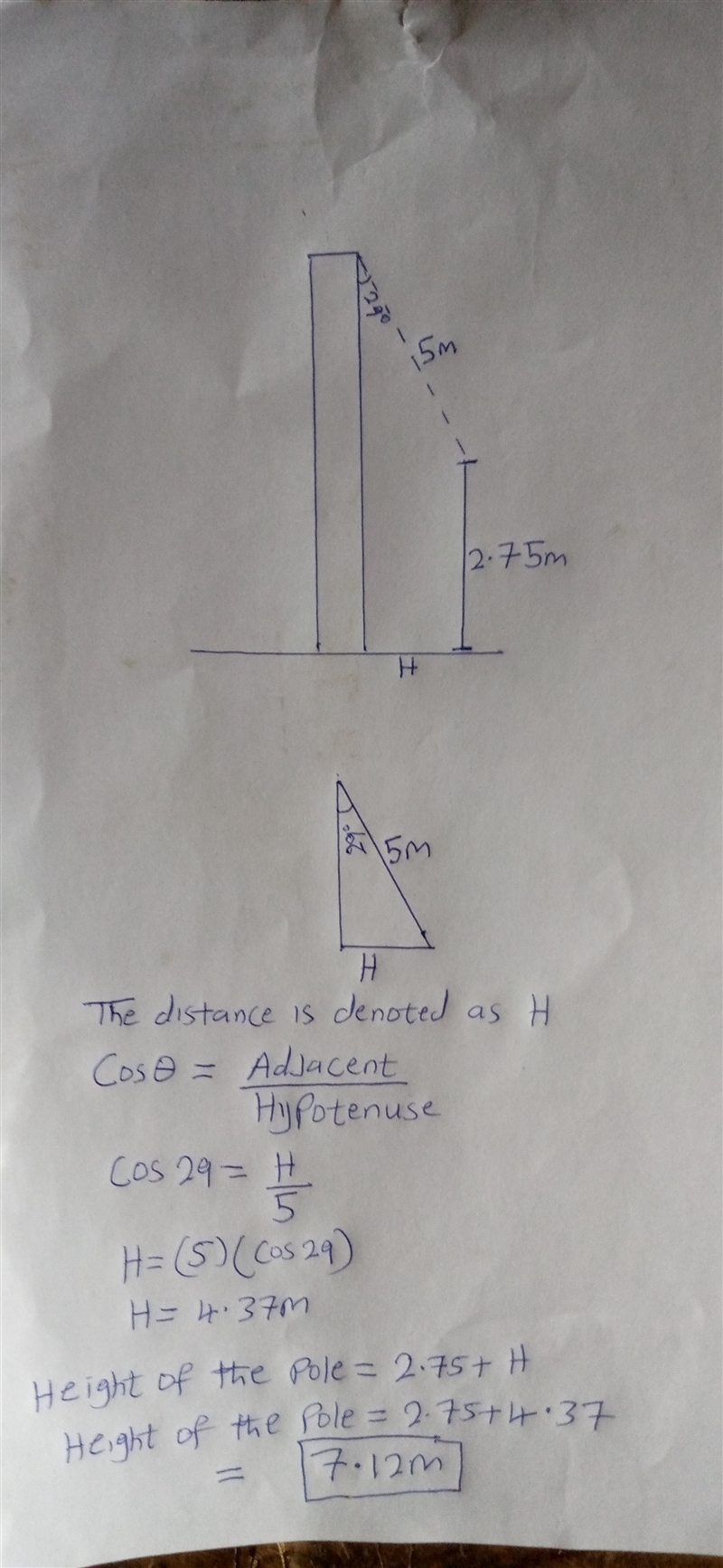 Howard is designing a chair swing ride. The swing ropes are 5 meters long, and in full swing they tilt in an angle of 29 degrees. Howard wants the chairs to be 2.75 meters above the ground in full swing. How tall should the pole be? Round your answer, if necessary, to 2 decimal places.