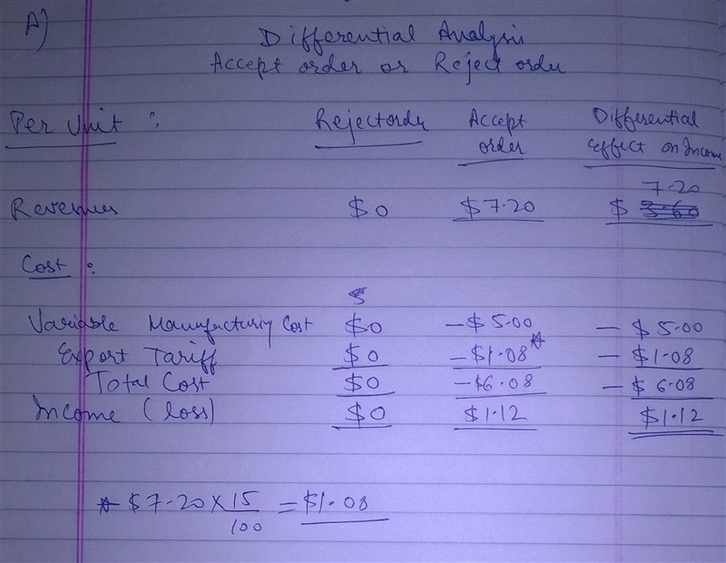 Product A is normally sold for $9.60 per unit. A special price of $7.20 is offered for the export market. The variable production cost is $5.00 per unit. An additional export tariff of 15% of revenue must be paid for all export products. Assume there is sufficient capacity for the special order. a. Prepare a differential analysis dated March 16 on whether to reject (Alternative 1) or accept (Alternative 2) the special order. Round your answers to two decimal places. If an amount is zero, enter "0". For those boxes in which you must enter subtracted or negative numbers use a minus sign.