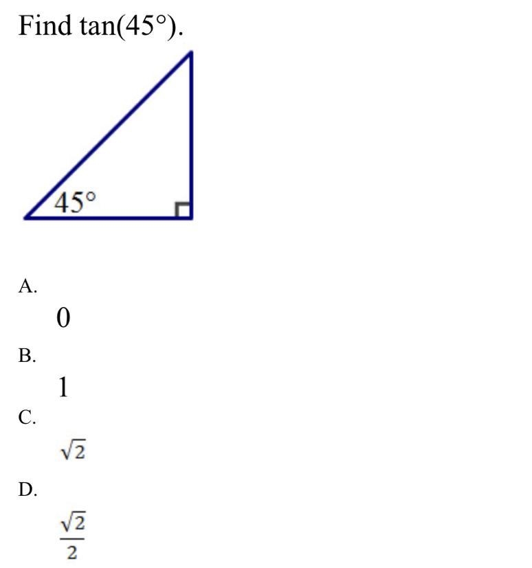 tan is (opposite)/(adjacent). In the triangle you can see that the opposite and adjacent sides are the same length, because it's a 45-45-90 triangle. So, something divided by the same thing will give 1.