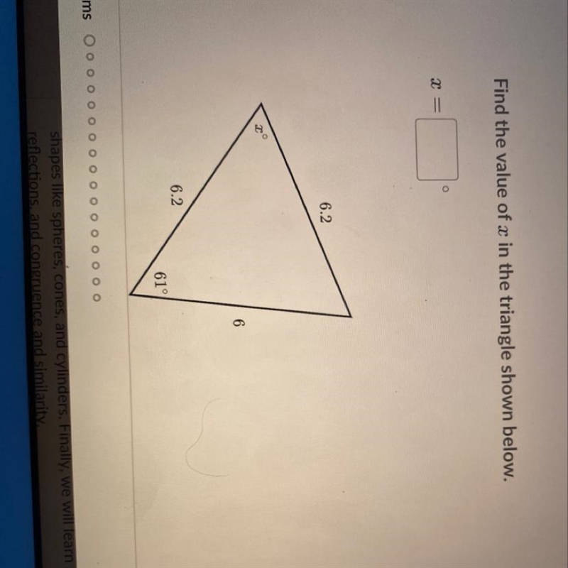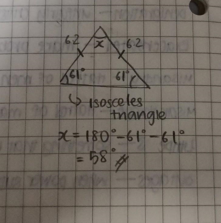 since the triangle has two sides of the same length (6.2cm), this means that it is a isosceles triangle, and that also means that the two angles at the base are the same (both will be 61 degrees)